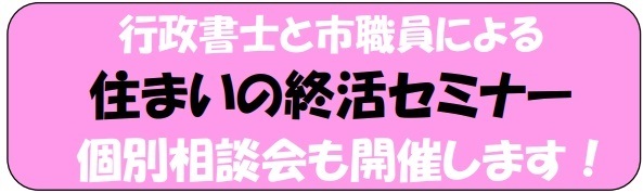 秦野市「住まいの終活セミナー」「個別無料相談会」開催 令和7年11月8日(土)13:00~15:00 秦野市立図書館 2階視聴覚室にて神奈川県行政書士会秦野伊勢原支部の主催、秦野市(交通住宅課)の共催で 「住まいの終活セミナー」と「個別無料相談会」を開催します。 (秦野市)「住まいの終活セミナーパンフレット」(PDF/500KB)はこちらをご覧ください。 申込は令和7年10月15日(水)8:30から電話(秦野市交通住宅課0463-82-9642)でのみ受付けます。 セミナー、個別相談会(ともに無料)の参加をお待ちしております。